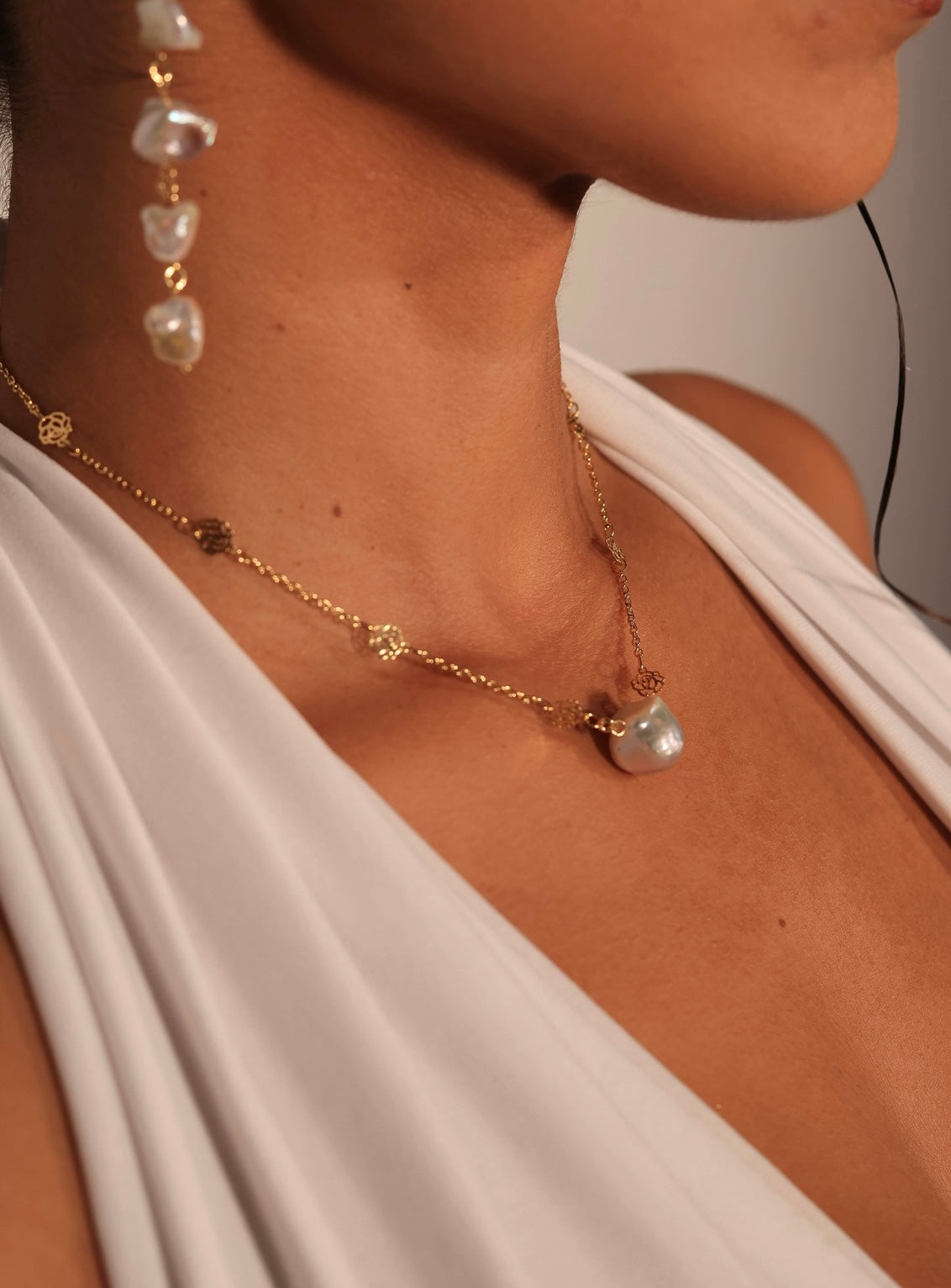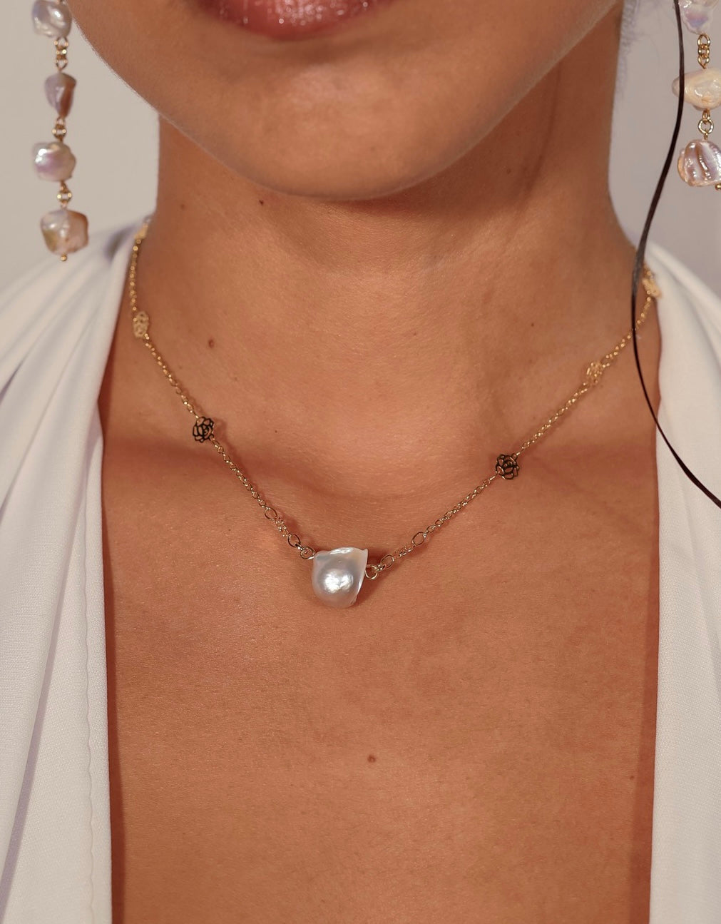Esta pieza one of a kind hecha a mano está compuesta de perlas de agua dulce. Las Perlas se asocian con la pureza, la juventud y la inmortalidad. Se consideran amuletos para atraer riqueza y fortuna. Proveen calma y concentración.