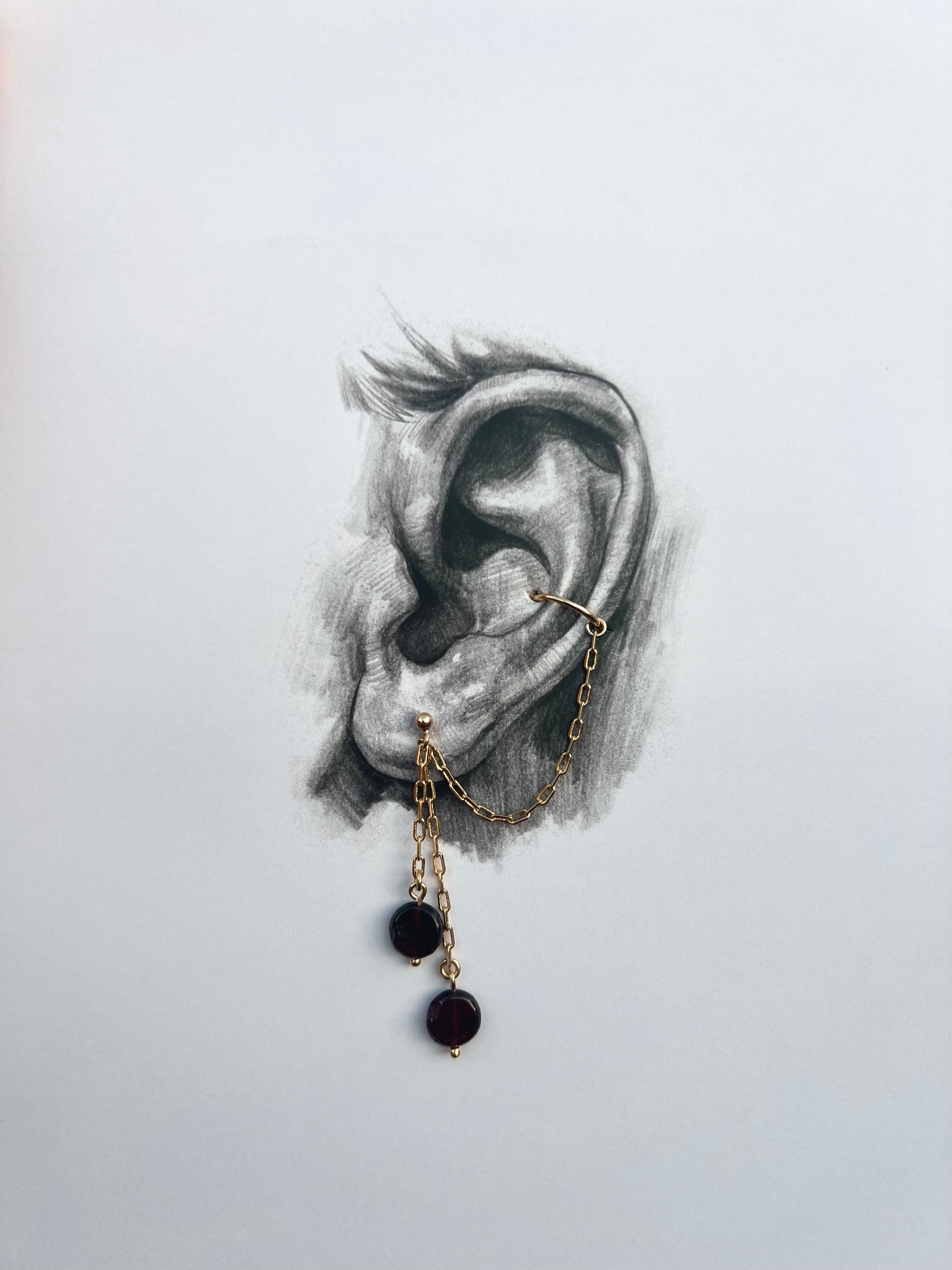 • Esta pieza •ONE OF ONE• hecha a mano está compuesta por piedras garnet genuinas. Es un stud unido a un cuff mediante una cadena.